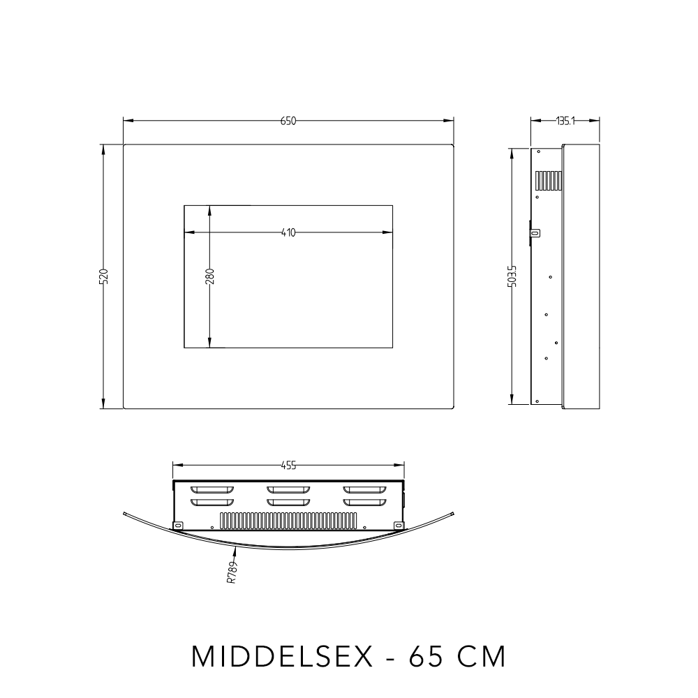 Middlesex er en elektrisk pejs til at montere på væggen. Pejsen har en kurvet front, der giver et unikt udtryk. Vælg mellem 2 størrelser.
